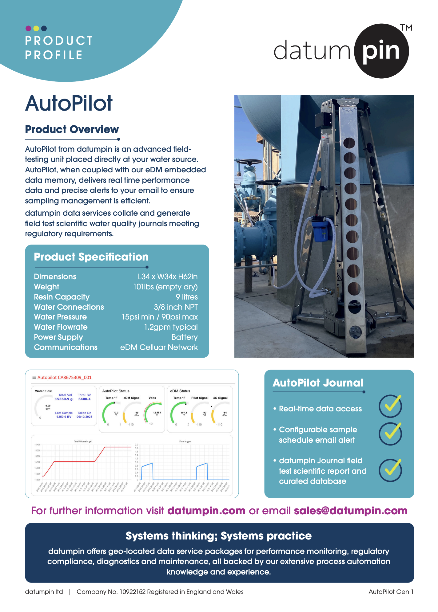 AutoPilot is an IoT enabled field testing unit designed for deployment at the water source. Engineered for precision and reliability, AutoPilot continuously monitors and reports treatment loading and water quality parameters in real time. When integrated with our proprietary eDM (Embedded Data Memory) system, it delivers instant performance data and critical alerts straight to your inbox ensuring efficient, proactive sampling management, even pausing at your selected sample points to ensure accurate and repeatable results.